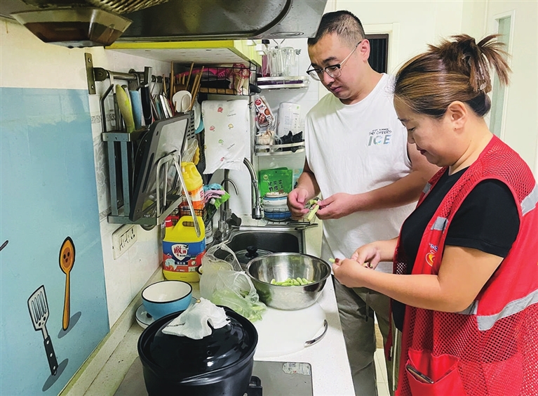 西红柿炒鸡蛋、清炒西葫芦、蒸米饭、煮粥……几天下来,小张的厨艺大有长进,完全可以应付得了一日三餐。看着“徒弟”的手艺,网格员心里也是满满的成就感。