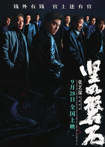 2019年开机拍摄的电影《坚如磐石》,由雷佳音、张国立、于和伟、周冬雨、孙艺洲、李乃文、许亚军、田雨、何政军、陈冲、王迅等实力派演员出演,是张艺谋导演暌违多年再度回归现实题材的作品,张艺谋导演在此基础上大胆尝试,首次挑战当代都市犯罪领域,结合罪案、人性、官场等元素,聚焦新时代发展浪潮中的人性挣扎与公平正义,在创作源头对权钱交易、黑恶势力与保护伞狼狈为奸等敏感话题进行大胆深入的探索,延展出错综复杂的时代发展图景。