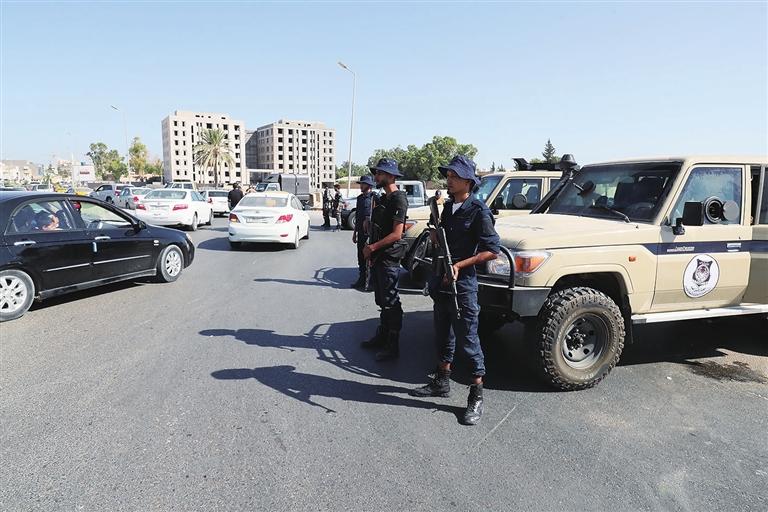 8月16日,利比亚冲突停火后,利比亚公共安全部门人员在的黎波里的艾因扎拉区保障安全。