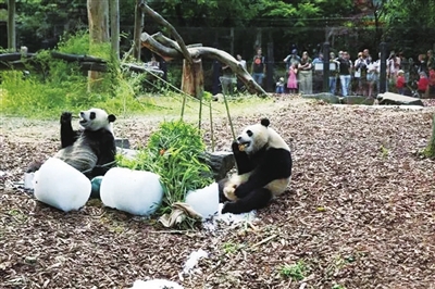 8月16日,在比利时布吕热莱特的天堂动物园,大熊猫双胞胎“宝弟”(左)、“宝妹”享用“生日大餐”。