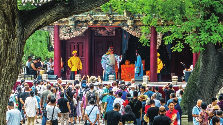 8月19日,晋祠古庙会上好戏连台,引来游客阵阵掌声。为期5天的晋祠古庙会,吸引上万游客慕名前来,寻觅历史之美。 记者 宿晓健 摄