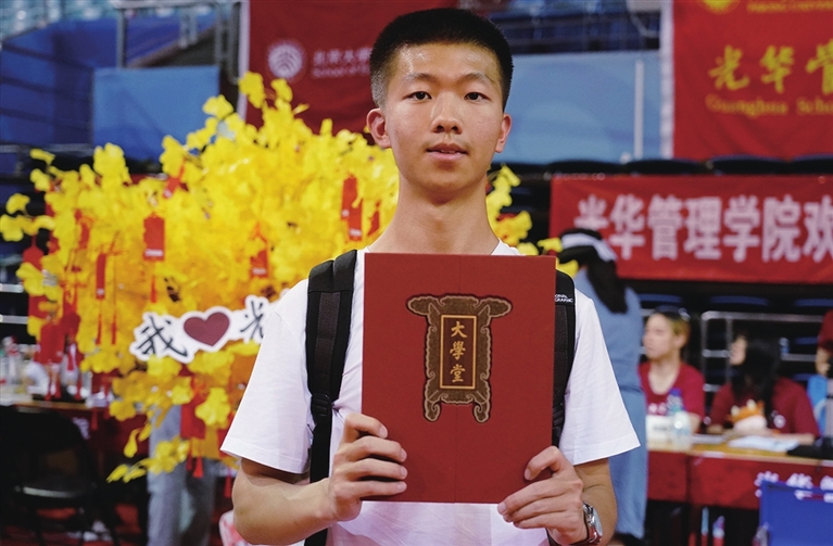 8月19日,在北京大学邱德拔体育馆,一名光华管理学院的2023级本科新生展示录取通知书。