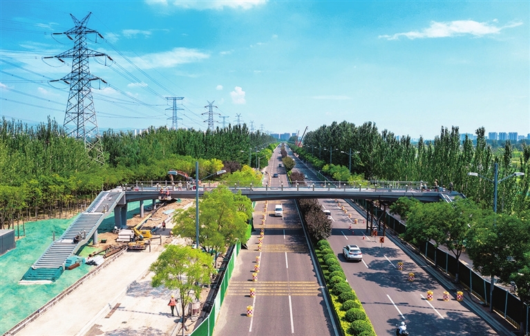 8月22日,雁丘园滨河东路人行天桥桥体箱梁吊装施工完毕,工人正在进行配套设施建设。该天桥建成后,将方便滨河东路东侧市民进入汾河景区。 王韵菲 摄