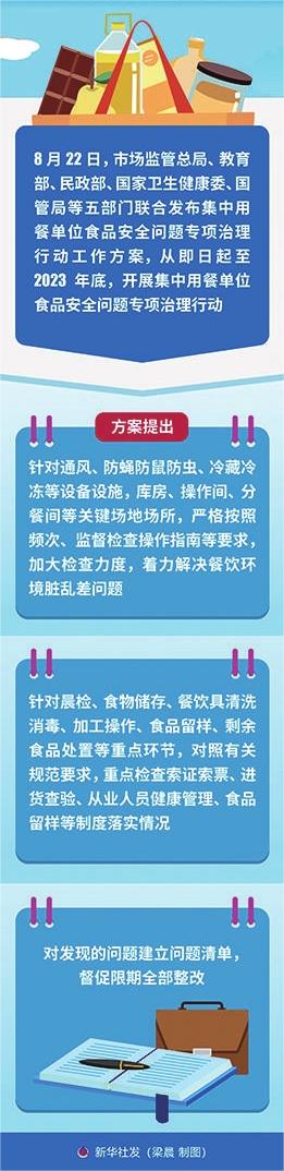 新华社北京8月22日电(记者赵文君)22日,市场监管总局、教育部、民政部、国家卫生健康委、国管局等五部门联合发布集中用餐单位食品安全问题专项治理行动工作方案,从即日起至今年年底,开展集中用餐单位食品安全问题专项治理行动。