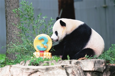 当天上午,饲养员们把专门为“小奇迹”设计和制作的多层水果蛋糕送到庭院里。“小奇迹”慢悠悠地走到蛋糕旁开始惬意享用。在场游客齐声为“小奇迹”唱生日快乐歌。