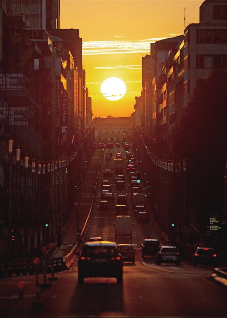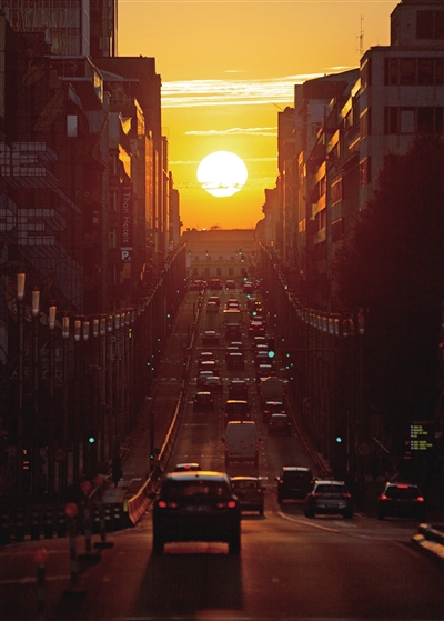 当日,在比利时首都布鲁塞尔,夕阳从主干道法律大街上空缓缓落下,形成“悬日”景观。
