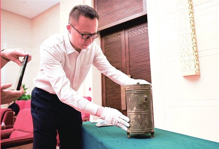 8月22日,工作人员介绍西汉河平元年铜鋞。 该铜鋞由热心公益文化事业的童琳高、王超两人在国内拍卖市场购得,随后联合捐赠给中国国家博物馆。 新华社 发
