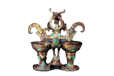 这件“合卺杯”是两个高足铜杯的联合体。在二杯之间,有鸟兽各一。鸟在上,立足于兽背,长颈,口衔玉环,将两杯相连,浑然一体,寓意婚姻受神鸟庇护、夫妻一心同体,同甘共苦,白首偕老。