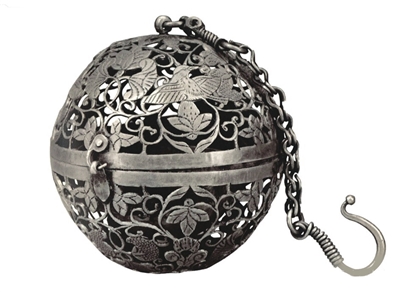 西安何家村曾出土一批精美的唐代金银器,被认为多为唐皇室的日常用品,其中就有一枚银香囊,外面雕有镂空的葡萄花鸟纹,从内而外分别由香盂、机环、外壳铆钉相接,既可以自由转动,又能保证盛香料和炭火的香盂始终朝上,不会打翻。