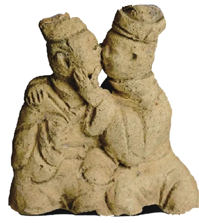 从造型上看,男俑高帽长袖,头部微微侧偏,右手搭在女俑香肩上,左手抚摸着女俑秀美脸颊。女俑身着长袖长裙,挽发髻于脑后,右手弯曲前胸;左手下垂膝盖,头左侧含情脉脉地接受男俑的亲吻。