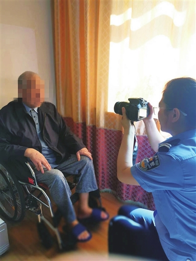了解情况后,社区民警王雪莉立即承诺可提供上门服务。随后,民警带领辅警,携带照相机来到刘奶奶家。民警、辅警用轮椅将老大爷推到客厅,找好拍照位置,并帮他整理衣服、调整坐姿。经过20多分钟的努力,民警采集到了符合要求的照片,帮助老人解决了难题。