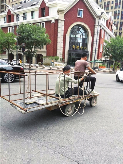 拍摄经过:8月22日,我途经阳光南街与阳光西路交叉口,看到一名男子骑着改装的四轮电动车,驮着铁架子行驶在机动车道上。令人瞠目的是,铁架子里居然坐着一名男子,看着十分危险。