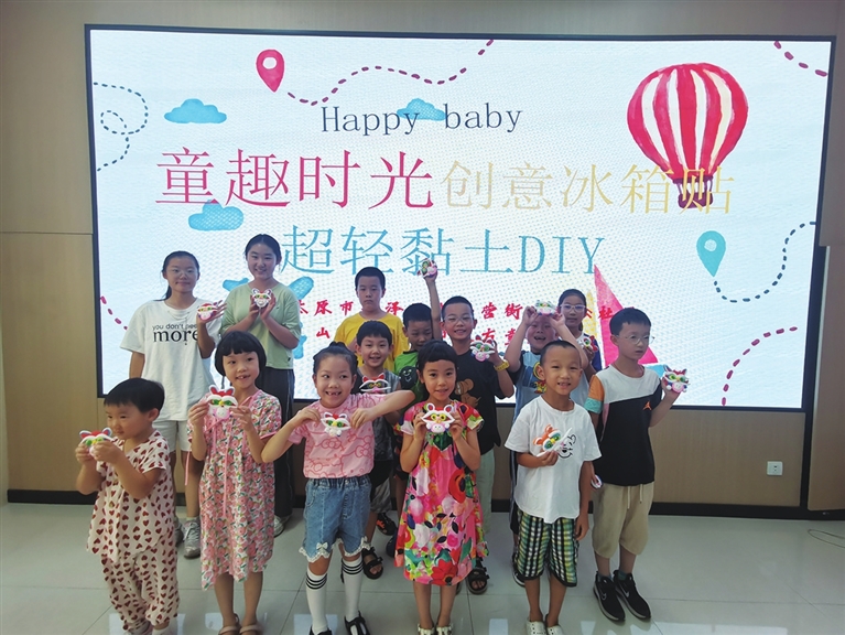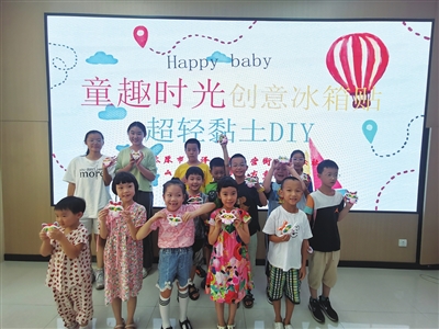 8月24日上午,老军营街道劲松社区开展“童趣时光 创意冰箱贴超轻黏土DIY”活动。孩子们使用黏土做出各种形状的冰箱贴,感受动手的乐趣。