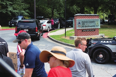 数十名特朗普支持者24日守候在加强安保的富尔顿县监狱外,被视作特朗普忠诚盟友的佐治亚州极端保守派联邦众议员玛乔丽·泰勒·格林也在内。