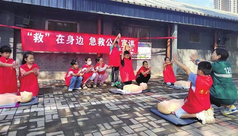 市第九人民医院急救中心的医生就抢救生命原则、心肺复苏、气道异物梗阻以及儿童溺水如何急救等,以生动的语言、真实的案例,指导孩子们熟悉相关知识和技能,并借助医用模拟人讲解急救知识的操作步骤。孩子们经过亲身体验,进一步强化了安全意识,一定程度上掌握了急救技能。