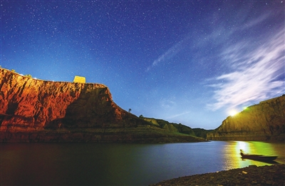 黄河老牛湾位于内蒙古自治区和山西省交界处。夜空下,峡谷两岸壁立千仞,黄河奔流不息,明长城依山而行,风光壮美。