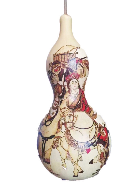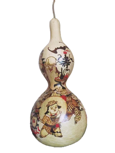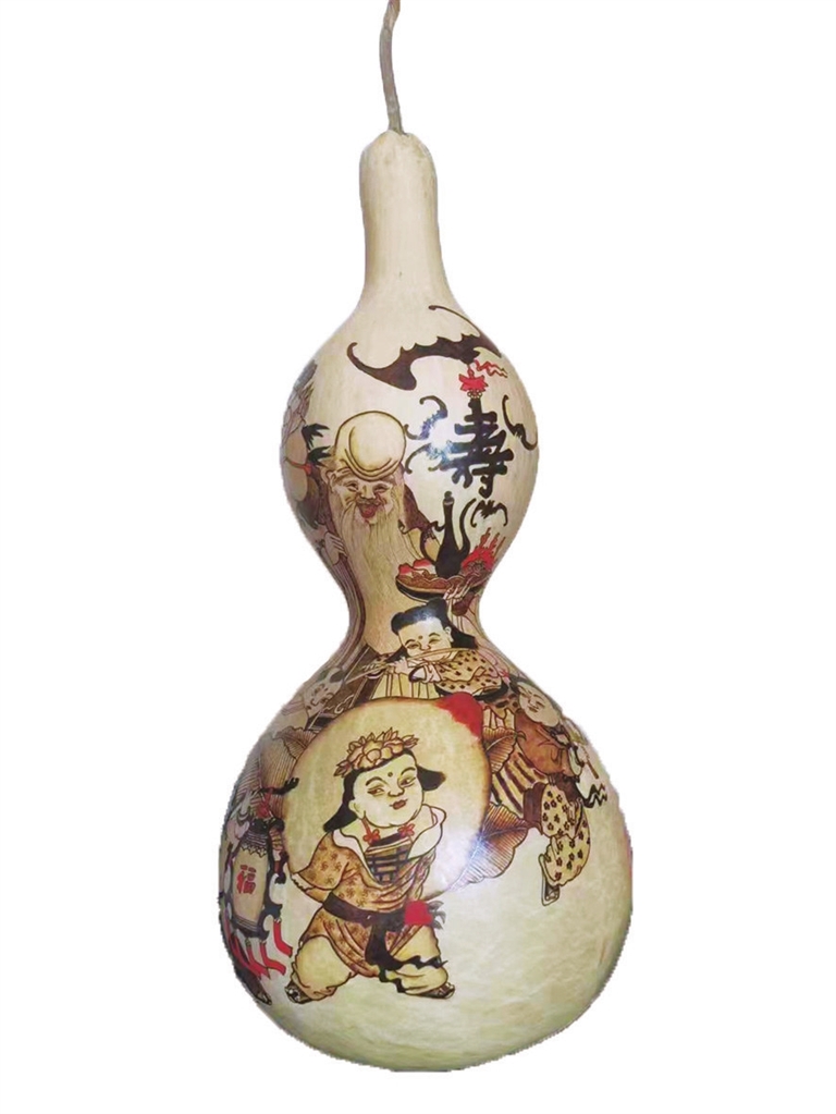 自从有了这只葫芦,我对建峰的葫芦画,便有了种一探究竟的欲望。前日下午,我给建峰打了个电话,确认他在家。于是,拐进了村里的高层住宅小区,叫开他家的门,便见迎面的客厅里,博古架上、阳台隔断的花格内,甚至鱼缸盖上,一眼望去,几乎全是古色古香的烫画葫芦。这些葫芦,大小不一,形状各异。高者,有一尺大几,矮者则不仔细看几乎找不到。其中大多为亚腰葫芦,但有的腰粗、有的腰细、有的肚圆、有的肚长、有的上下肚子差不多一般大、有的却上下悬殊。还有无腰的,既有圆圆如球状的,也有像个扳不倒的……而这些葫芦,无一例外,全都烫了黄褐色、以人物居多的吉祥图案,并点缀了少量颜色。与送我那个一样线条流畅、形象逼真、色彩柔和,而题字与画面也配合得恰到好处,书画相得益彰。看着这些精美的作品,你绝对想不到,它们统统出自一个只有初中文化水平的农村人之手。