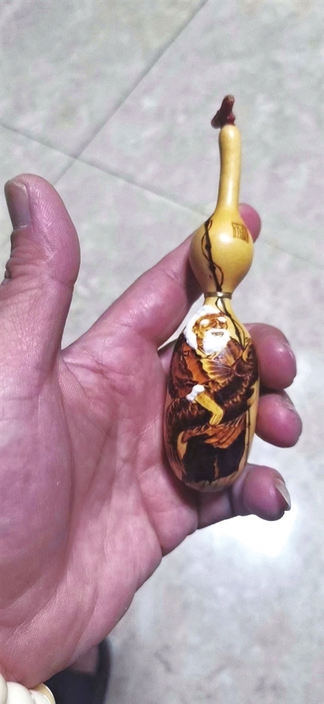 不料,今年开春后的一天,建峰竟给我抱来一个他画好的,约有35厘米高的大葫芦过来,说是专为我画的。同时,又从衣袋里摸出一个高约六七厘米的小细腰葫芦来,说是可带在身边,随时把玩。这样,我就第一次近距离见到了建峰的葫芦。