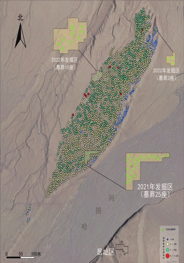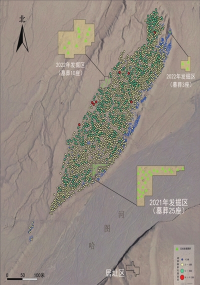 此外,联合考古队在该遗址发现三片墓地,总面积12万平方米,共有墓葬3228座,现已发掘52座。“目前已发现大量陶器、铜器、石(玉)器、骨器、木器、编织物和人骨、动植物遗存,为诺木洪文化研究提供了大量的实物资料。”杜玮说。