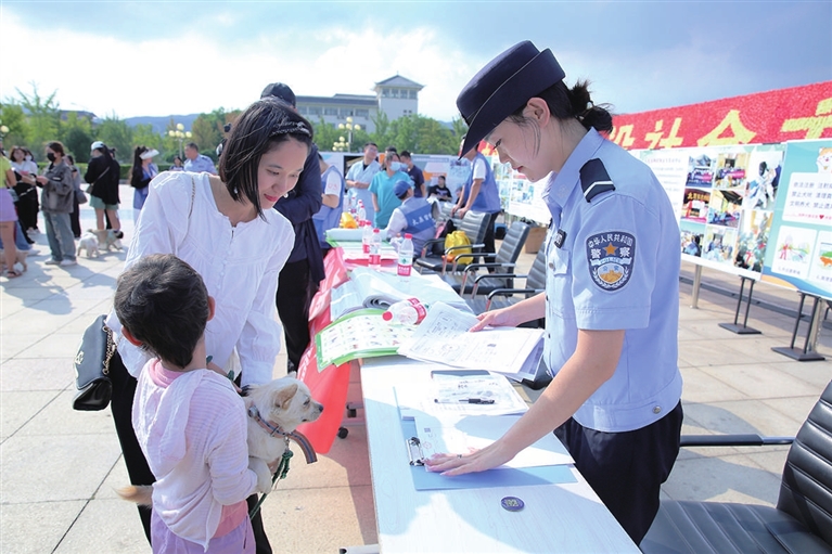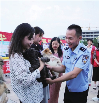 为了加强犬类管理,市公安局决定聘请百名不文明养犬义务监督员,随时监督市民的不文明养犬行为,共建文明城市,倡导文明养犬。活动现场,市公安局治安管理支队相关负责人向5位热心市民,颁发不文明养犬义务监督员证。