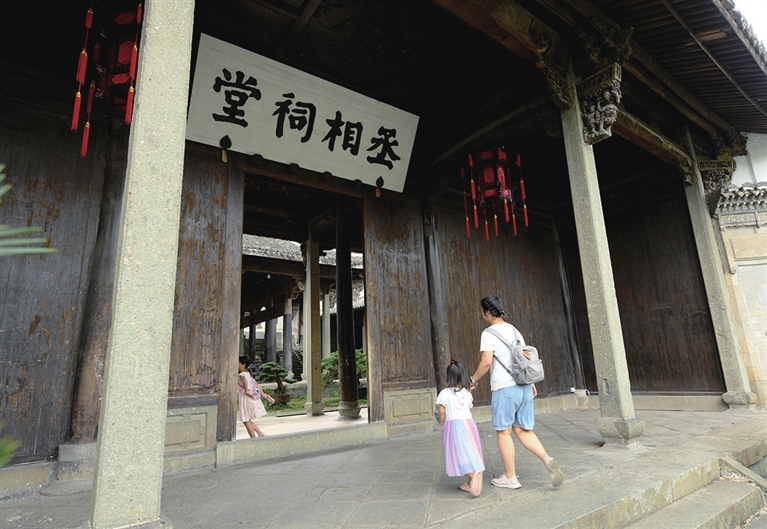 时值暑期,村民诸葛品余每天会在自家沿街的铺面里打开扇面,誊写诸葛亮的《诫子书》《出师表》,路过的孩童不时张望,有的干脆走进屋里,跟着背诵起来。一件折扇纪念品,承载着传统村落厚重的文化。
