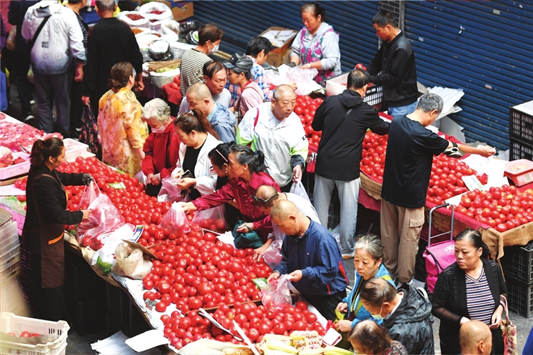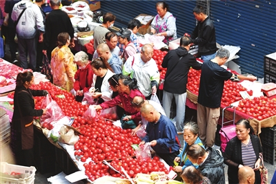 随着我市周边县区地产西红柿等果蔬大量上市,满足了市民需求。图为8月30日开化寺早市上选购新鲜菜品的市民。 邓寅明 摄