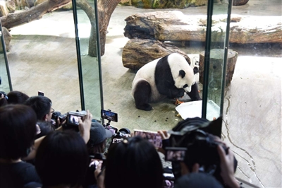 “圆圆”一进场就慢步走向蛋糕,先从摆放在“生日快乐”中间的苹果吃起。在伸出爪子拔甘蔗时不慎将蛋糕打翻在地,引来围观的游客一阵欢呼,并祝它生日快乐。随后,“圆圆”端坐着慢条斯理地品尝起散落在地上的蔬果,偶尔抬头看向围观的粉丝,引来成片的快门声。