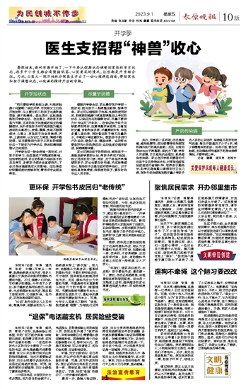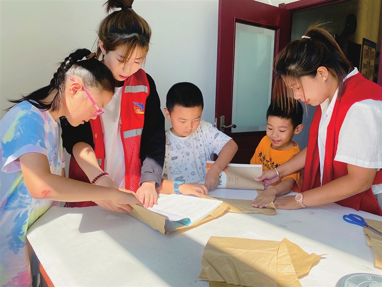 “根据书的形状把书皮纸折一下,剪出两个梯形折口……”开学之际,御德苑社区的暑假最后一次社会实践活动就是包书皮。靳如昕等网格员从家里找来了旧挂历、旧杂志等材料,手把手教孩子如何包书皮,锻炼了孩子的动手能力。这样的“手工课”连日来在其他社区也能见到。