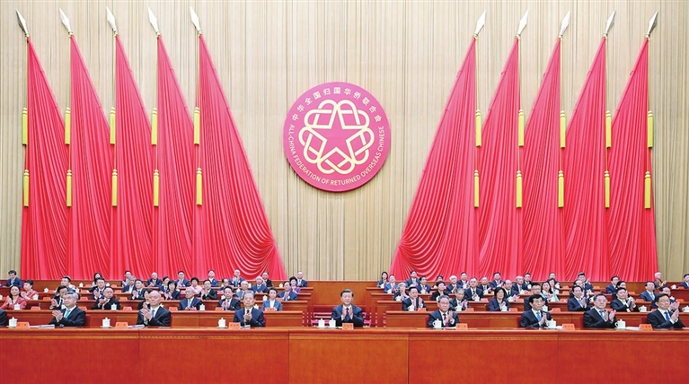 人民大会堂大礼堂气氛庄重而热烈。主席台上方悬挂着“第十一次全国归侨侨眷代表大会”的会标,后幕正中是象征着五大洲侨胞心向祖国的中国侨联会徽,10面红旗分列两侧。二楼眺台悬挂着“以习近平新时代中国特色社会主义思想为指导,全面贯彻党的二十大精神,团结凝聚广大归侨侨眷和海外侨胞为全面建设社会主义现代化国家、全面推进中华民族伟大复兴而奋斗!”巨型横幅。来自全国各地的近1200名归侨侨眷代表和来自100多个国家的近600名海外侨胞特邀嘉宾欢聚一堂。