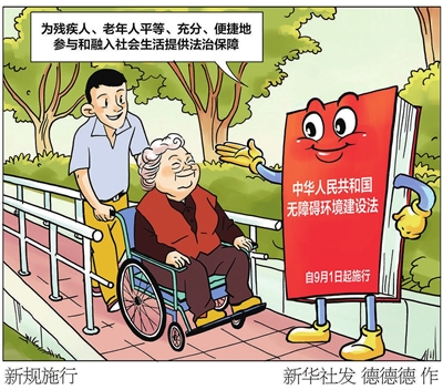 《中华人民共和国无障碍环境建设法》自9月1日起施行,为残疾人、老年人平等、充分、便捷地参与和融入社会生活提供法治保障。