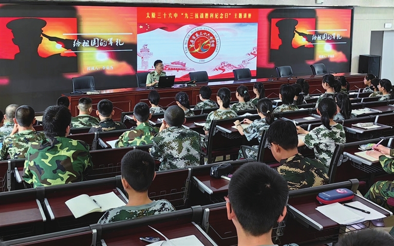 本报讯(记者 张晓丽 文/摄)在第78个抗战胜利纪念日来临之际,太原三十六中特邀武警山西总队机动支队少校股长李俊杰警官在初一年级开展了抗战胜利纪念日主题讲座,为学生们带来了新学期爱国主义教育第一课,激励广大学生赓续红色血脉,努力报效祖国。