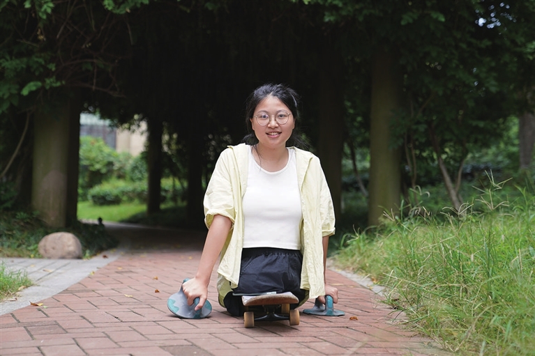 使用滑板出行的蒋张子怡(8月31日摄)。