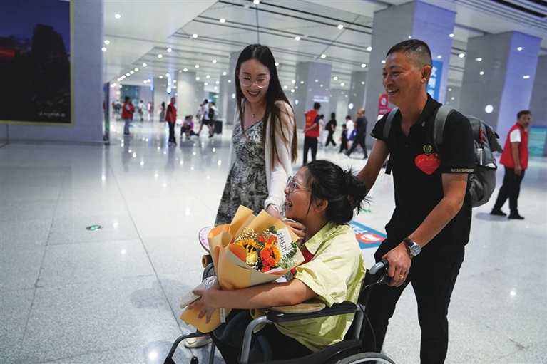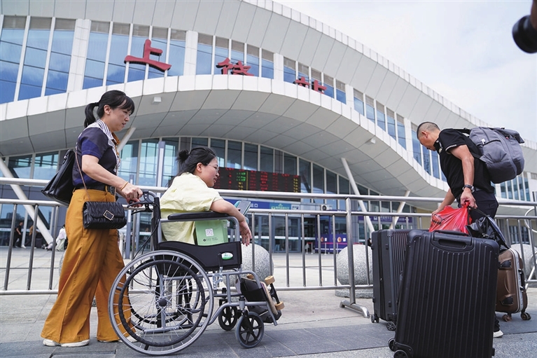 蒋张子怡和父母一起抵达车站准备乘车前往山东临沂(8月31日摄)。