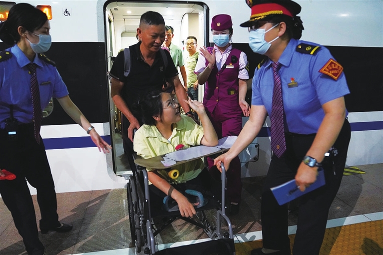 到站后,蒋张子怡向铁路工作人员致谢(8月31日摄)。