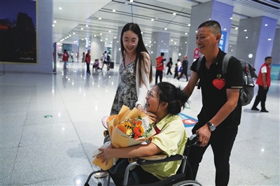 抵达山东临沂后,学校老师向蒋张子怡送上了花束(8月31日摄)。