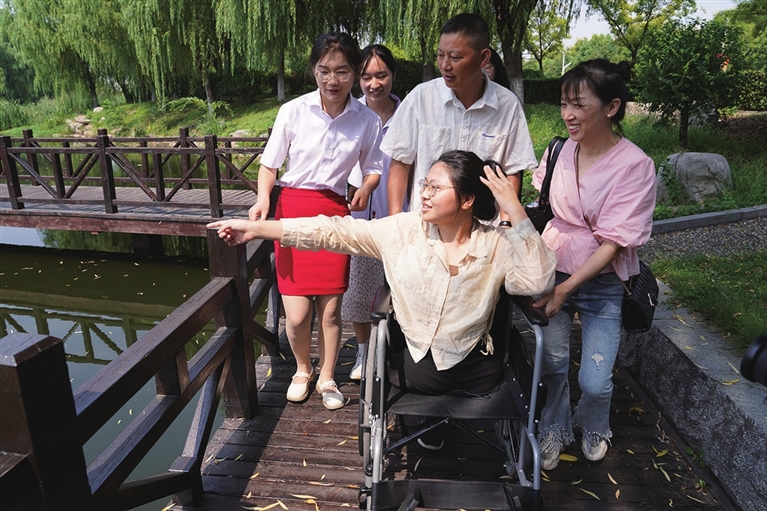蒋张子怡和父母一起在学校工作人员陪同下参观校园(9月1日摄)。