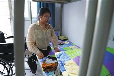 蒋张子怡在学校寝室里收拾衣物(9月1日摄)。