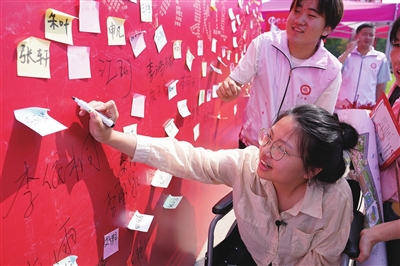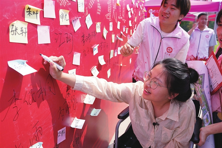入校登记后蒋张子怡在签名墙上留名(9月1日摄)。