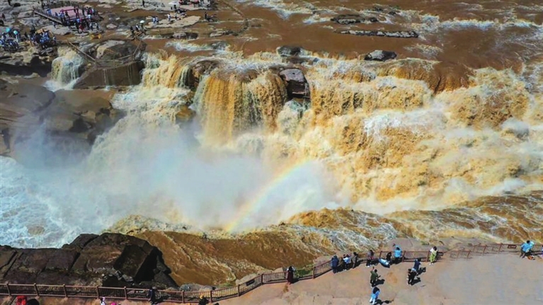 近日,位于秦晋峡谷中段的黄河壶口瀑布出现彩虹通天美景。黄河壶口瀑布主、副瀑布连成一片,气势磅礴,景色壮美,吸引了不少游客前来驻足观看、拍照留念。
