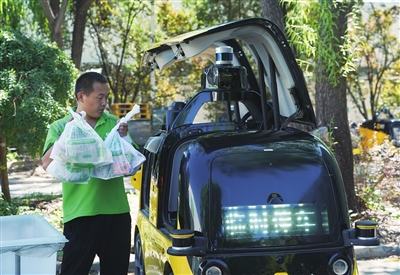 在北京市顺义区,一辆辆自动配送车有序行驶在道路上。顾客下单后,工作人员将订单放入自动配送车中,这些车辆根据规划好的路线,自动驾驶到指定停车点位,用户可通过手机验证码等方式取出订单,或者通过骑手在停车点拿取订单并配送到顾客手中。