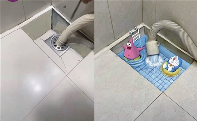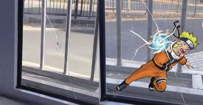 这条视频火了之后,触动了唐子曦创作的神经,她开始经常在生活中寻找这样的“小意外”,裂掉的墙皮、受潮的墙角、碎掉的玻璃窗等都成为了她的创作灵感。“我家在一楼,容易被小石子砸到窗子。有一次回家发现家里的玻璃碎了,本来心情很糟糕。但我对着那个破损的地方看了一会儿,忽然想能不能把它画成一幅画。我联想到了《火影》里鸣人丢螺旋丸的样子,就把它画了出来,没想到一点都不违和,甚至变得有趣;再比如家里装修师傅铺的连接地漏的地砖太丑了,我对着那个水管看了一会儿,就想到把水管旁边的地砖画成泳池,在边上画上了游泳的派大星和哆啦A梦。这样一来,本来装修的瑕疵就变成小巧思了。”
