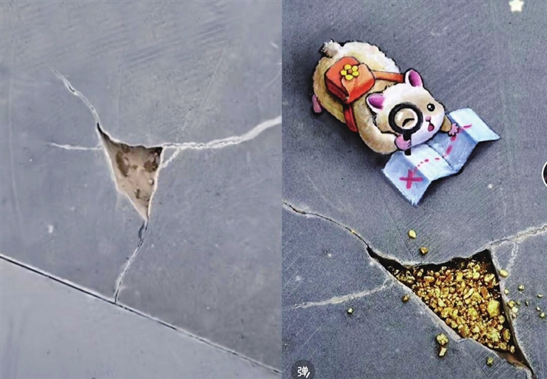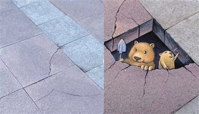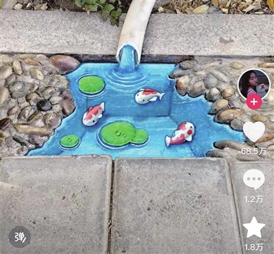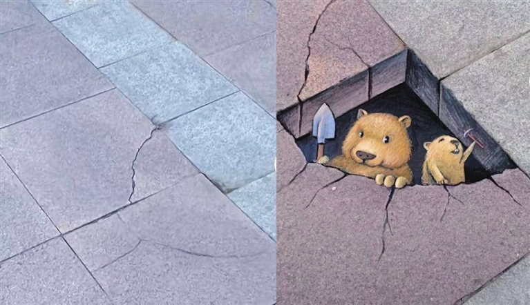 这些马路边的“小精灵”因为精致可爱,充满巧思,让很多行人驻足观看,有的路人还会拍下照片发到博主的评论区“打卡”,有趣的“艺术品”吸引了近300万粉丝。唐子曦说,马路“小精灵”系列其实是自己意外为之,“有一次下班路上看到一块地砖的一角有两条裂缝,强迫症看得难受,就突发奇想能不能给它美化一下,也是受到了一位外国博主的启发,我在地砖上开始作画。先把出现裂缝的一角涂黑,画出一个洞穴的形状,再在洞穴里画上探头探脑的小熊和小鼠。天然的裂缝成了洞穴的边缘,两只小家伙跃跃欲试,仿佛随时能跳出洞穴,十分逼真。画完后我自己很满意,就拍了视频发到网上,结果这个视频收获了接近70万的点赞。”