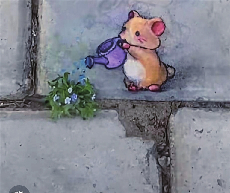 “网友们被治愈着,其实我也时常被温暖到,有一次我在农场附近看到了掉落的腐烂果子,就在旁边画上了正在搬运果子的刺猬。没想到过几天去看的时候,腐烂的果子被换成了一堆新鲜的果子,不知道是农场里的工作人员换的,还是附近的孩子换的,看到后我觉得很有意思,这种互动特别暖心。”平时在小区里,也总有一些陌生人守护着她的作品,“很多作品画完之后,会在那里留很久,没有人会去破坏,甚至有的人会搬些小石头作为装饰。”