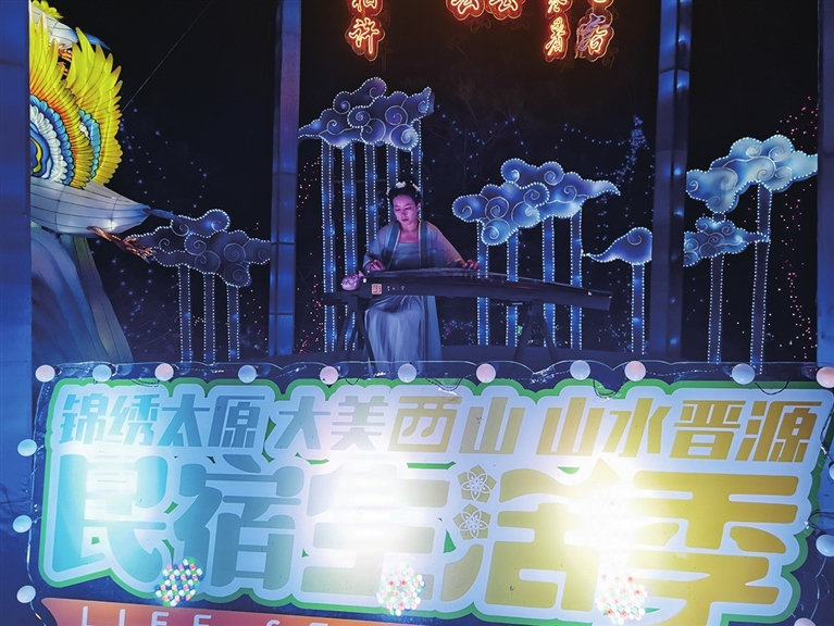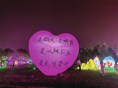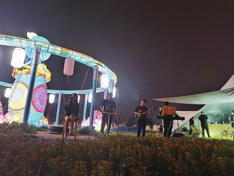 沿着花灯指引漫步向前,微风送来缕缕吉他弹奏声。循声而去,吉他手在草地上激情弹奏,穿着黑色T恤的男生手握话筒,专注演唱,“在阳光灿烂的日子里开怀大笑,在自由自在的空气里吵吵闹闹……”