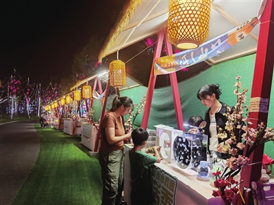 “妈妈快看,水母!”在文创市集区,小男孩看到玻璃缸中上下游弋的粉色、蓝色水母迈不动步,好奇观察。一顶顶黄色灯笼照亮摊位,女孩子们蘸上颜料,为素白的团扇绘上五颜六色;或者拿起彩线,将珠子穿成心仪的模样。