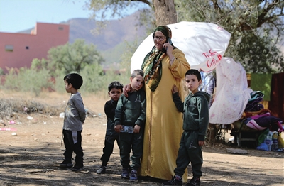 这是在摩洛哥震中附近的艾米兹米兹村一处临时安置点拍摄的受灾群众。