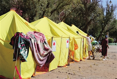 这是在摩洛哥震中附近的艾米兹米兹村一处临时安置点拍摄的救灾帐篷。新华社 发