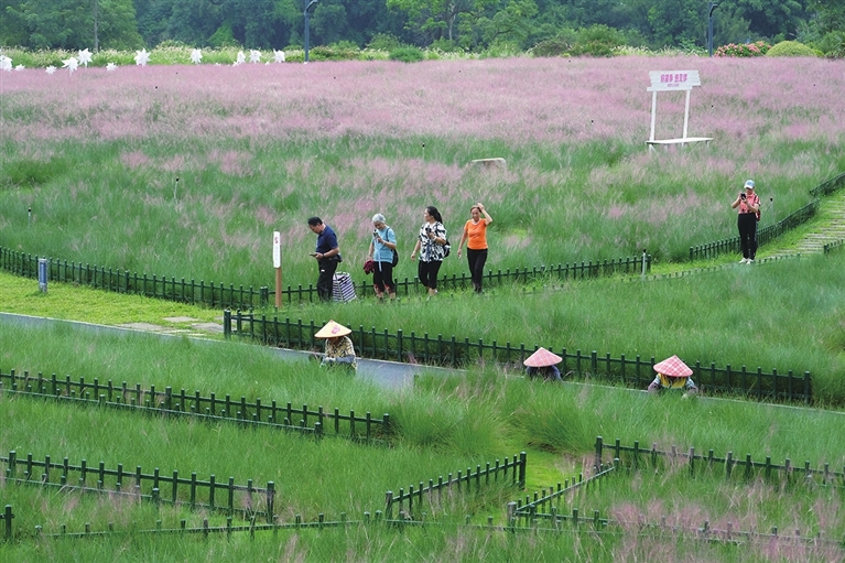 9月11日,游客在广西南宁市园博园观赏粉黛乱子草。
