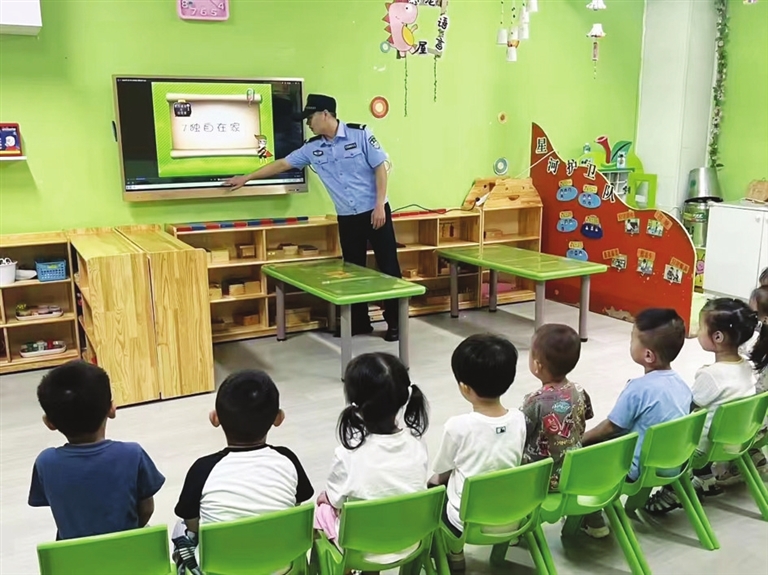 9月11日,桥东派出所民警来到辖区红乐幼儿园开展安全教育活动,通过互动问答、影片展示、以案说法等方式,给孩子们讲解交通安全、防拐防骗、消防安全等知识,让孩子们在活动中了解安全常识,提高自我保护意识。 辛欣 郭鹏程 摄