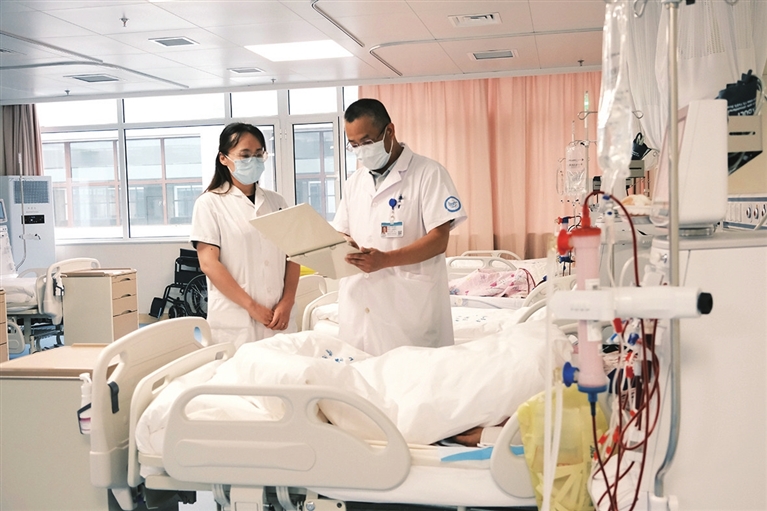 9月13日,刚刚投入使用的省人民医院和平院区肾内科血液净化中心,医务人员正为患者治疗。该中心提供的血液透析、血液滤过等服务,方便了患者就诊。 王韵菲 摄